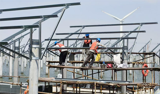 黃海新區(qū)響水片區(qū),6萬(wàn)余根管樁如鋼鐵森林般矗立在碧波之中。興悅新能源420MW漁光互補(bǔ)發(fā)電項(xiàng)目現(xiàn)場(chǎng)呈現(xiàn)一片繁忙有序的景象,頭戴安全帽、身著工作服的工人們,如同靈動(dòng)的音符,穿梭在一根根排列密集的工程樁之間,全神貫注地進(jìn)行著光伏支架和組件的安裝。2025-09-17 -